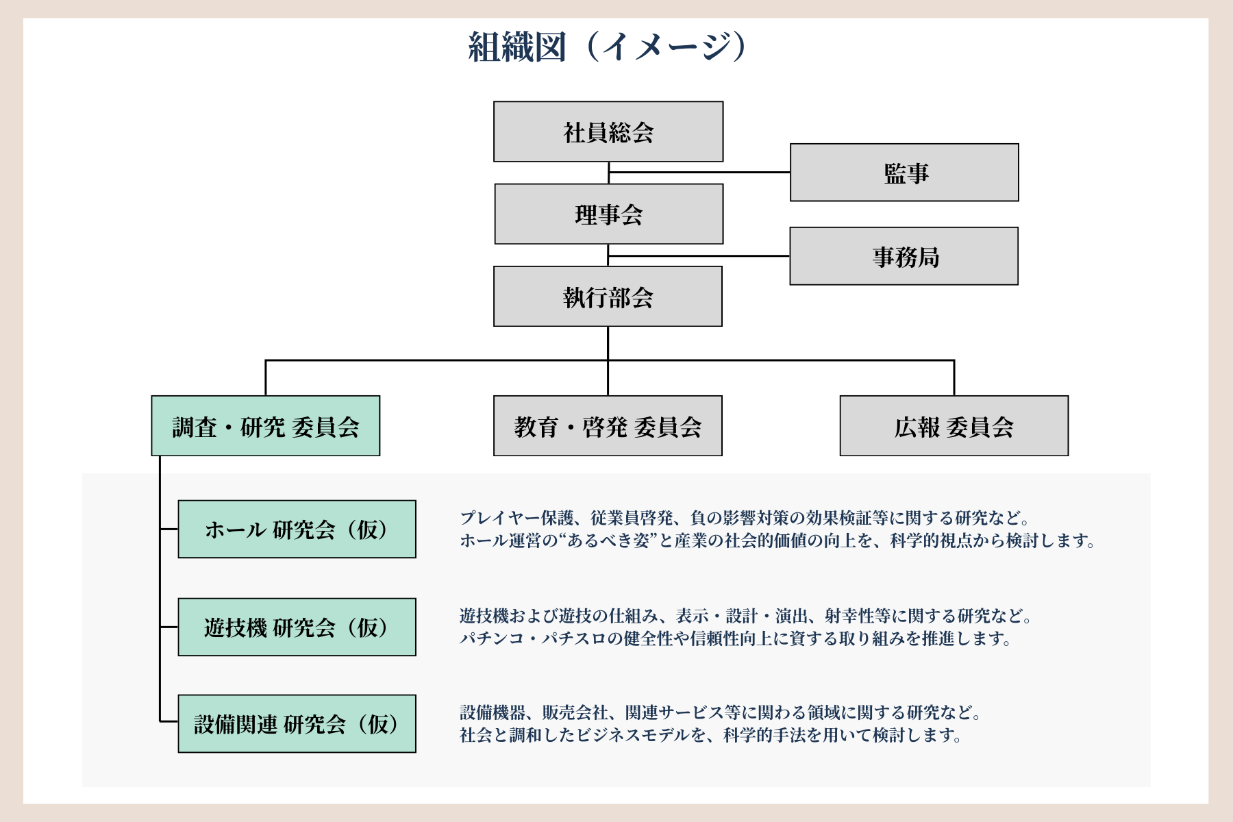 ホール、遊技機メーカー、設備機器、関連サービスなど、遊技産業を構成する幅広い分野にとって有益な科学的研究を推進し、その成果を国内外に向けて発信していきます。
